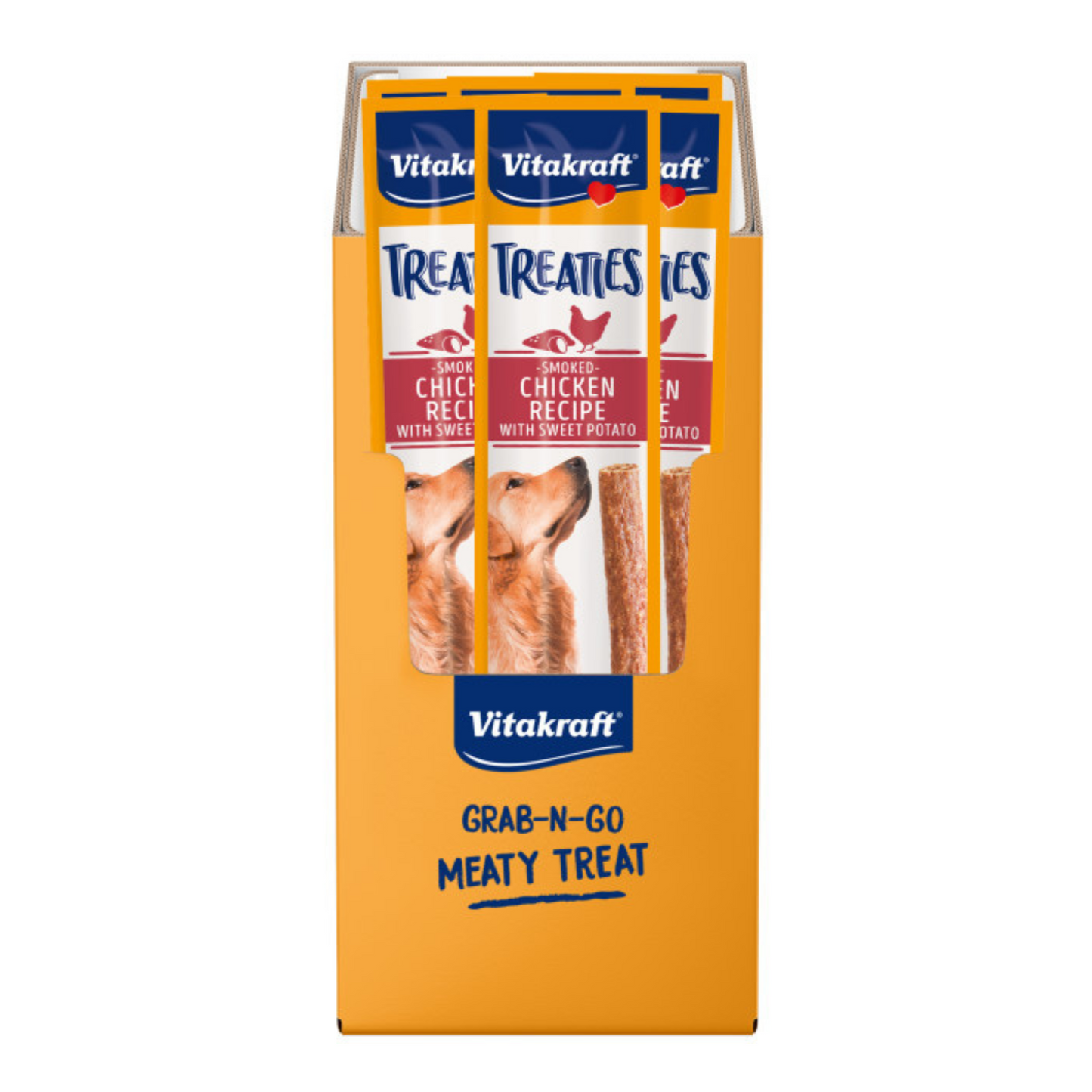 Vitakraft Treaties Smoked Chicken with Sweet Potato recipe is a grab-and-go treat for munchable fun while on the run. The perforated strips on the package allow for easy tear away for single stick servings. Made up of 87% pure chicken muscle meat each stick is free of artificial colors, flavors and preservatives with no added sugars. Enhanced with a smokey flavor your dog is sure to go wild for.