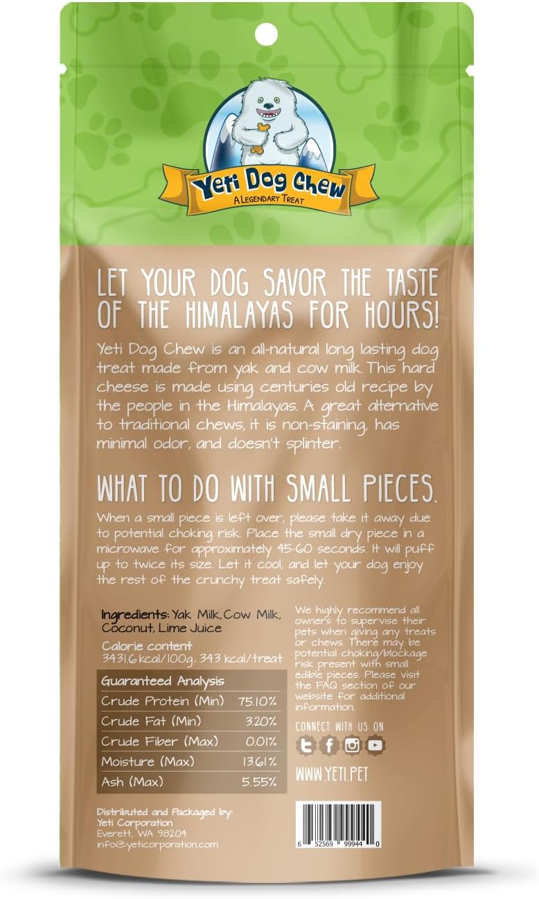 Treat your furry friend to the ultimate chewing experience with Yeti Fruit Chew in delicious Coconut Flavor. These healthy dog treats are crafted from 100% natural yak cheese, offering a delightful combination of flavor and durability. Made using traditional methods with yak milk, these Himalayan yak chews are a nutritious and long-lasting option for dogs of all breeds and sizes. Yeti's fruit chews are designed to satisfy your dog's natural chewing instincts. The hard texture of these yak cheese dog chews makes them perfect for aggressive chewers, providing hours of entertainment and helping to prevent destructive behaviors. Whether your dog is a large breed or a smaller companion, these yak chews cater to their needs, from yak chews for large dogs to yak chews for small dogs. Our yak chews are not only delicious but also incredibly healthy.