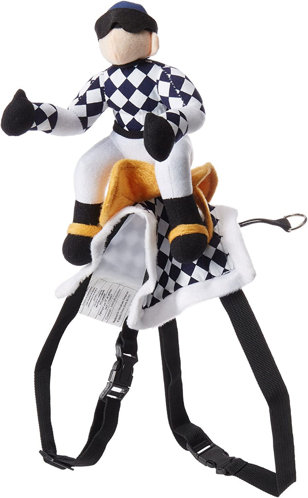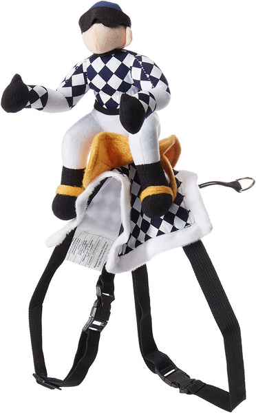 Available in 4 sizes. It's off the to races for dogs who like a sporting look, with the Zack & Zoey Show Jockey Saddle Costume! Adjustable nylon neck and belly straps and plastic buckles ensure a secure fit. The harlequin print on the 'horse blanket' under the cloth mini-saddle and matching print on the stuffed jockey's shirt add flair to this costume. With an attached d-ring this costume doubles as a harness so you can walk your dog around the block this Halloween!