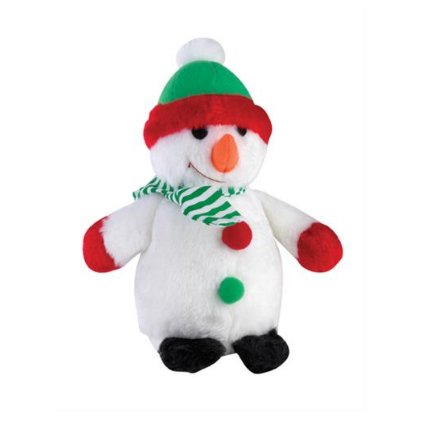 Holiday friends snowman dog toy is a musical way to sound out this holiday season. This dog toy plays a "We Wish You a Merry Christmas" song. Amuse and delight your dog with musical plush toys that play their favorite Christmas carols. This adorable dog toy is made of soft and durable plush in bright holiday colors that stand up to rough-and-tumble canine games. The sound chip inside the dog toy requires NO batteries. Snowman toy measures 9-inch in length.